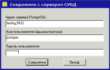 Данная утилита предназначена для работы с базами данных. При выборе в меню главного окна Центра управления SELTA@Etersoft пункта: Утилиты – Инициализация БД, откроется диалоговое окно с приглашением ввести параметры подключения к СУБД: